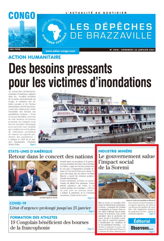 1月22日,剛果(布)發(fā)行量最大報(bào)紙《布拉柴維爾快訊》頭版發(fā)表文章《索瑞米項(xiàng)目成績喜人》。