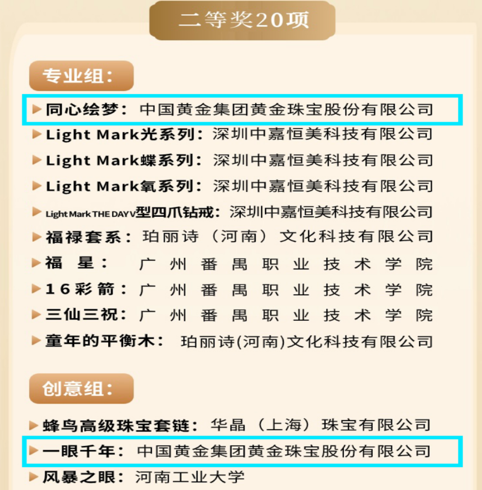 9月19日,2023培育鉆石設(shè)計大賽總決賽在鄭州舉行,在眾多參賽作品中,中金珠寶產(chǎn)品交易部(研發(fā)設(shè)計中心)設(shè)計師李佳音參賽作品“一眼千年”、設(shè)計師陳道熙參賽作品“同心繪夢”在本次大賽中分別獲得了創(chuàng)意組、專業(yè)組二等獎。