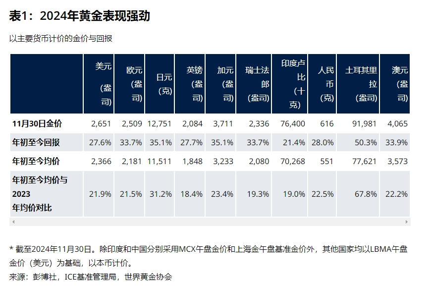 今年迄今為止,以美元計(jì)價(jià)的金價(jià)漲幅超過(guò)28%,年平均交易價(jià)格較2023年高出22%;其他貨幣金價(jià)表現(xiàn)同樣強(qiáng)勁(表1)。今年黃金已40次打破歷史記錄,三季度黃金需求總量首次超過(guò)了1,000億美元。