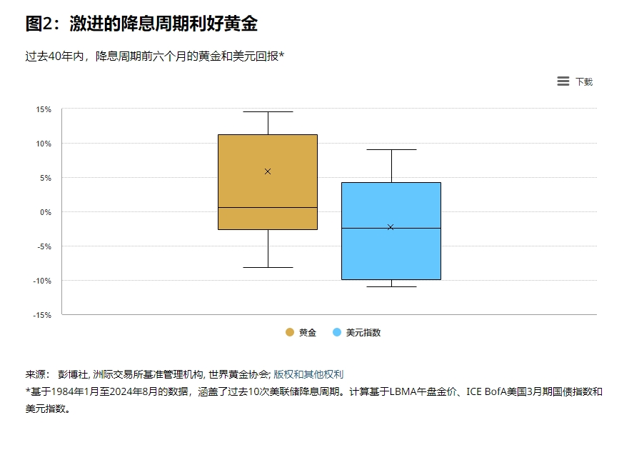 歷史數(shù)據(jù)表明,在降息周期開(kāi)始的前六個(gè)月,金價(jià)平均漲幅為6%。而隨后黃金的表現(xiàn)則受到降息周期的持續(xù)時(shí)間和深度影響(圖2)。